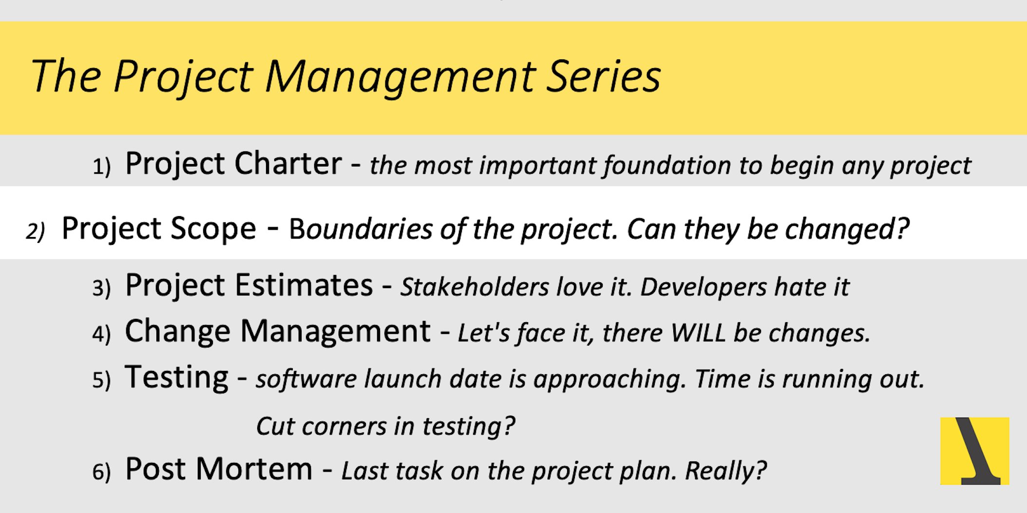 Every project has a scope. Has the scope been well-written? Has everything been accounted for? Once a scope has been set, can it be changed? Traditional project management sees ‘scope’ as the boundaries of the project and labels changes in scope as something negative that would likely delay the schedule and blow the budget. In reality, changes during a project are inevitable, especially for software development.